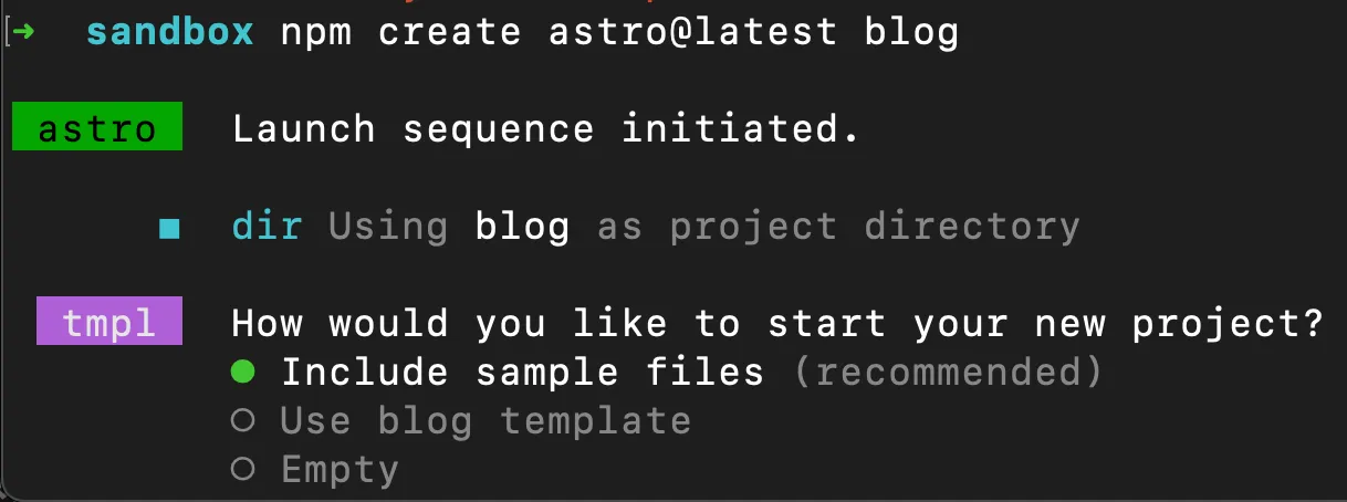 Simply run npm create astro@latest blog in your terminal, and you’ll be prompted to set up a new project: